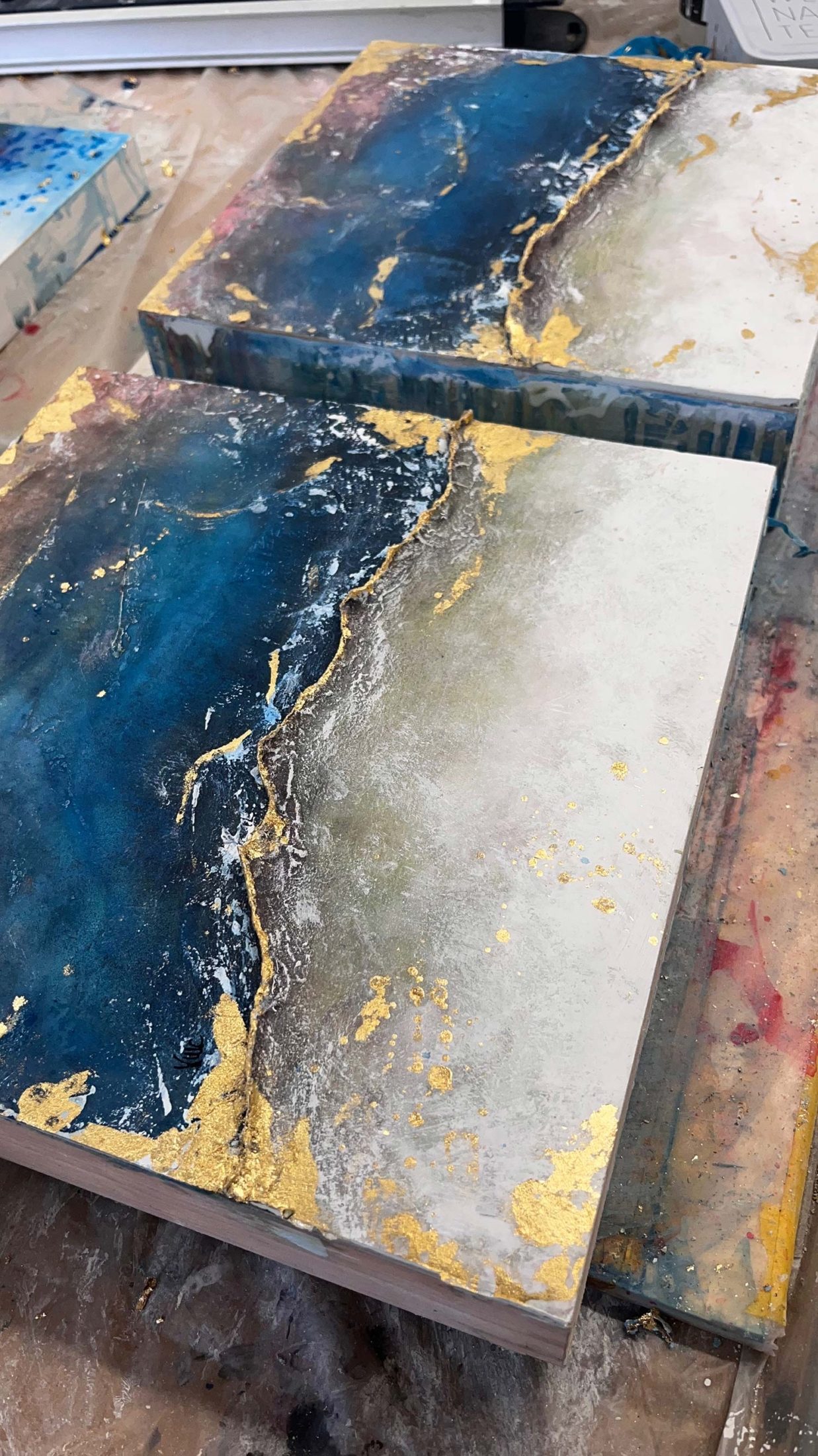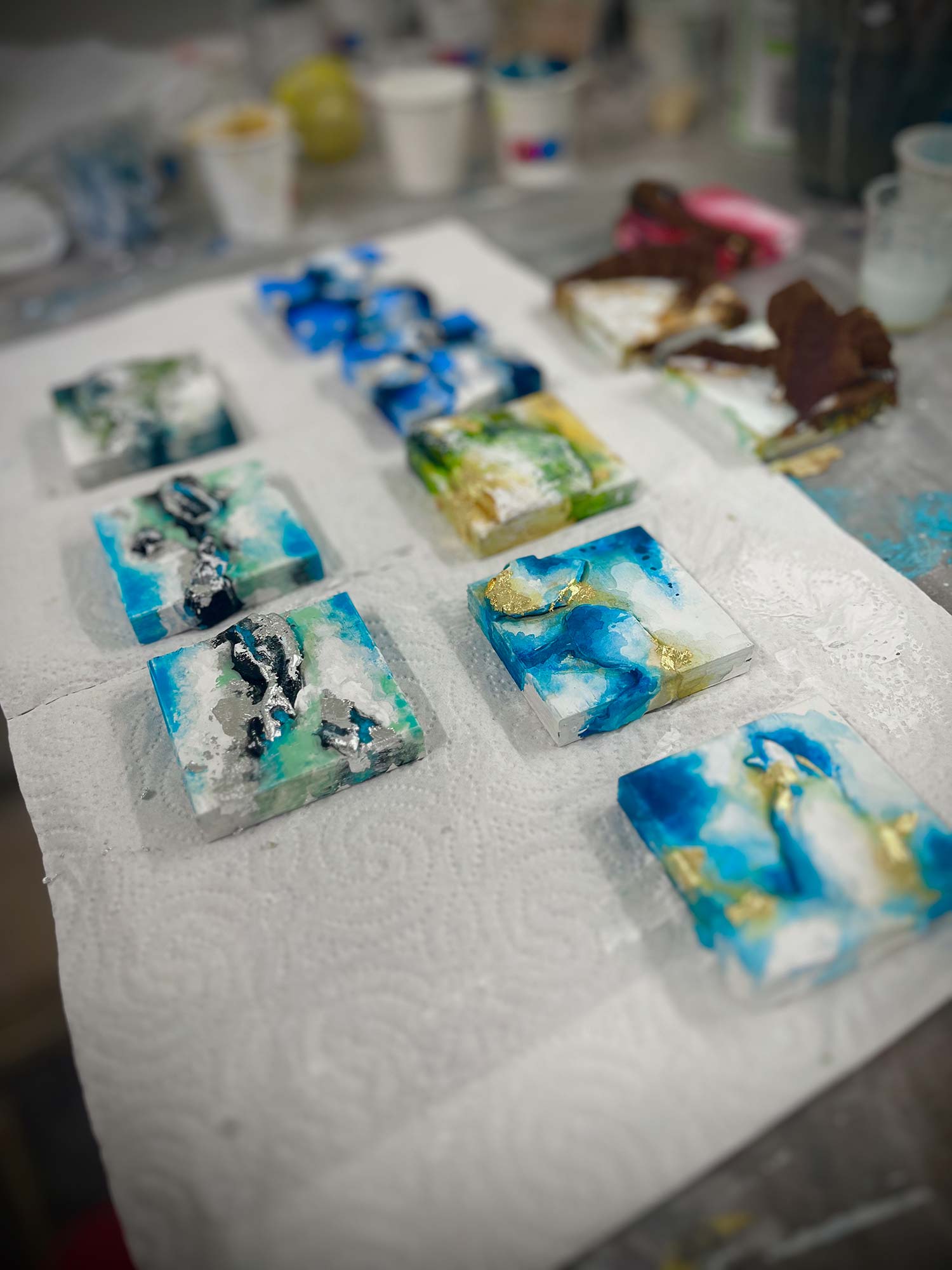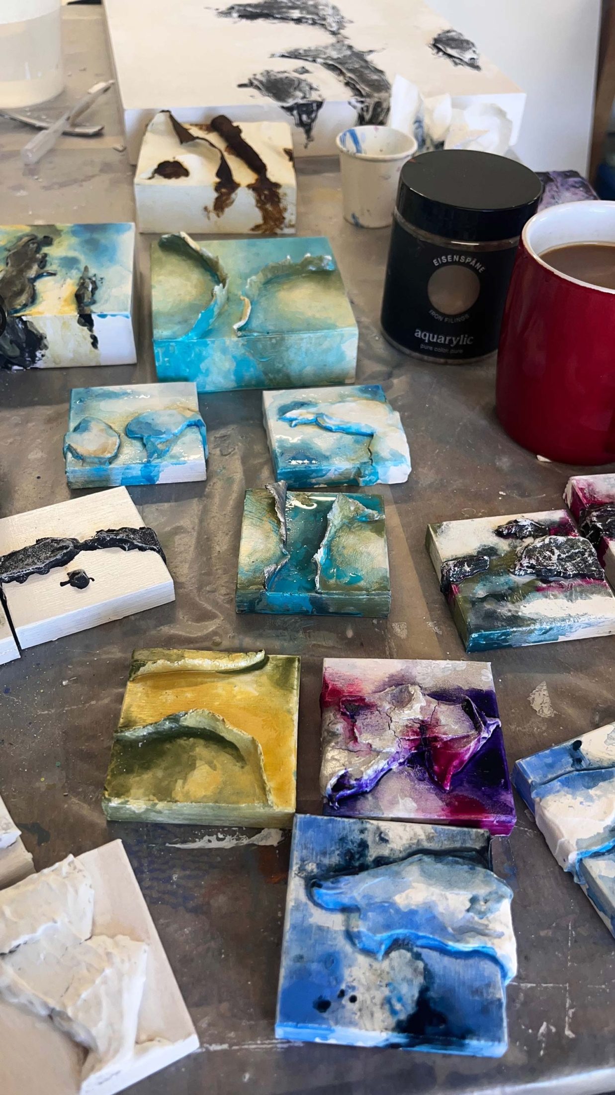 Außerdem war der Abend mit Sonnenuntergang in Eshaness so schön nachwirkend und prägend, dass ich beschloss, auch diese Inspiration in zwei etwas größeren Werken im Format 40 x 40 x 6 Zentimeter einfließen zu lassen. Ich begann also parallel auch mit diesen Arbeiten.