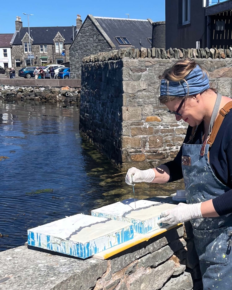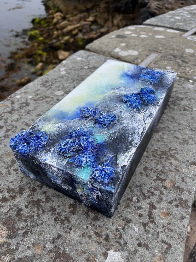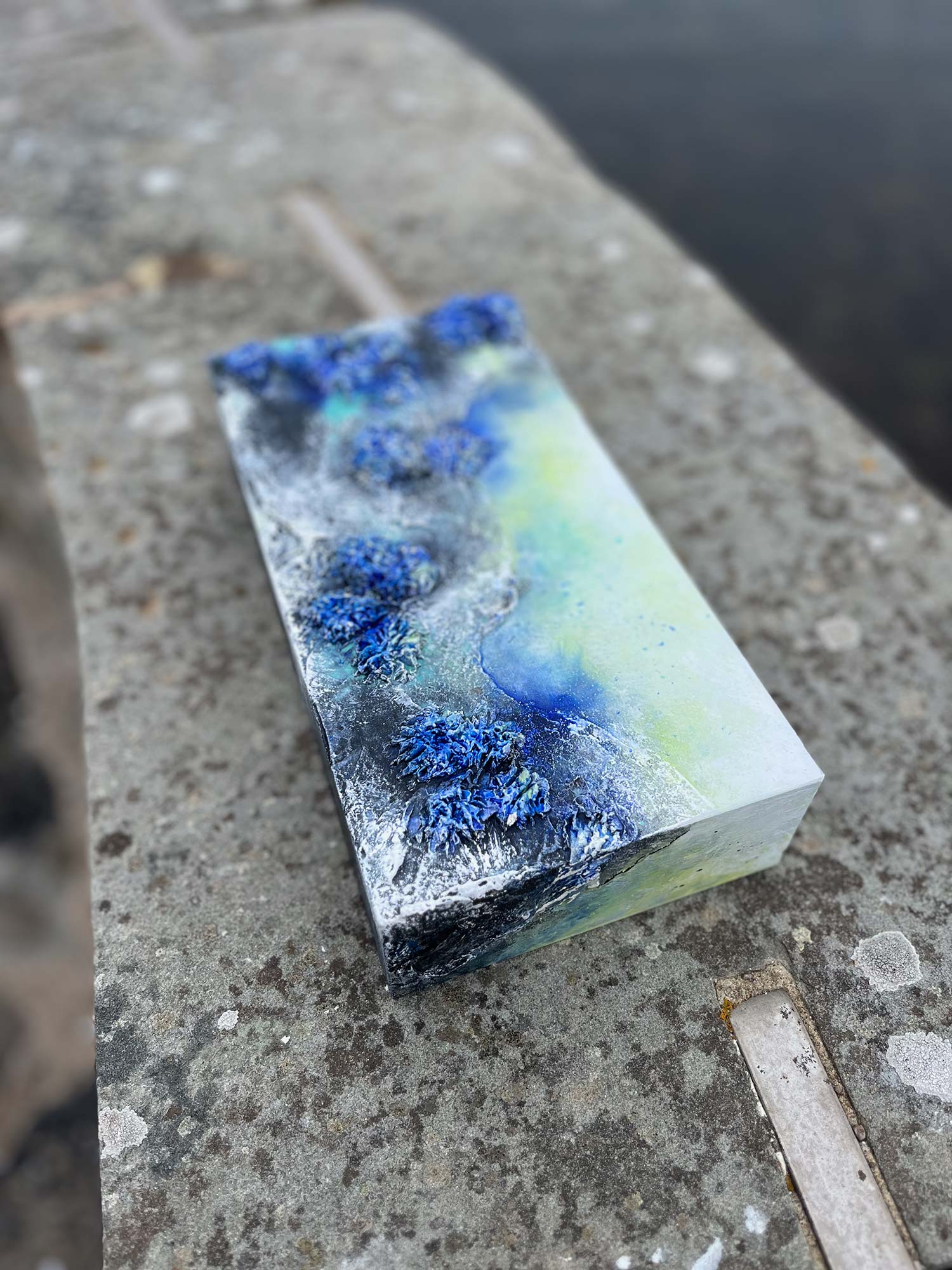 Außerdem war der Abend mit Sonnenuntergang in Eshaness so schön nachwirkend und prägend, dass ich beschloss, auch diese Inspiration in zwei etwas größeren Werken im Format 40 x 40 x 6 Zentimeter einfließen zu lassen. Ich begann also parallel auch mit diesen Arbeiten.