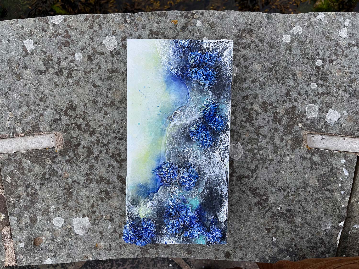 Das erste Werk war bereits fertig. Der Auftrag: die abstrahierten blauen Blumen von Shetland.