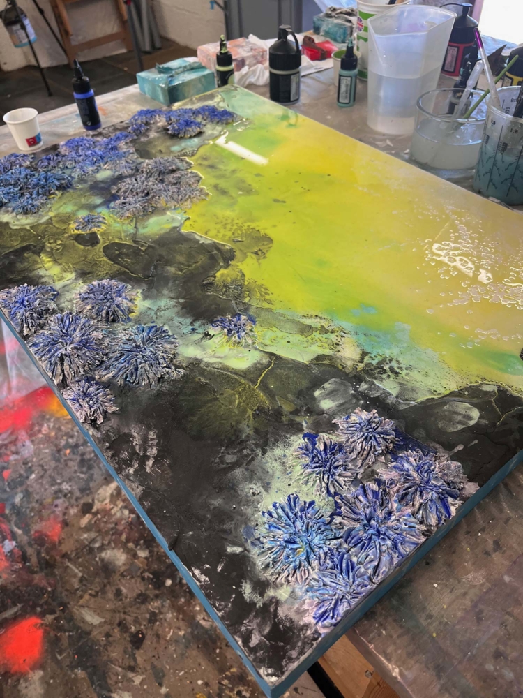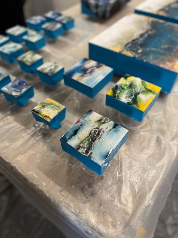 Der Moment, wenn das Harz gegossen ist, bleibt für mich immer wieder faszinierend. Schon beim Auftragen bekommen die Farben eine ungeahnte Tiefe und beginnen regelrecht zu leuchten. Mein größter Reflex ist dann, die Oberfläche anzutippen, was ich mir natürlich streng verkneife. Denn jede Berührung in den ersten 24 Stunden würde Fäden ziehen oder unschöne Spuren hinterlassen.