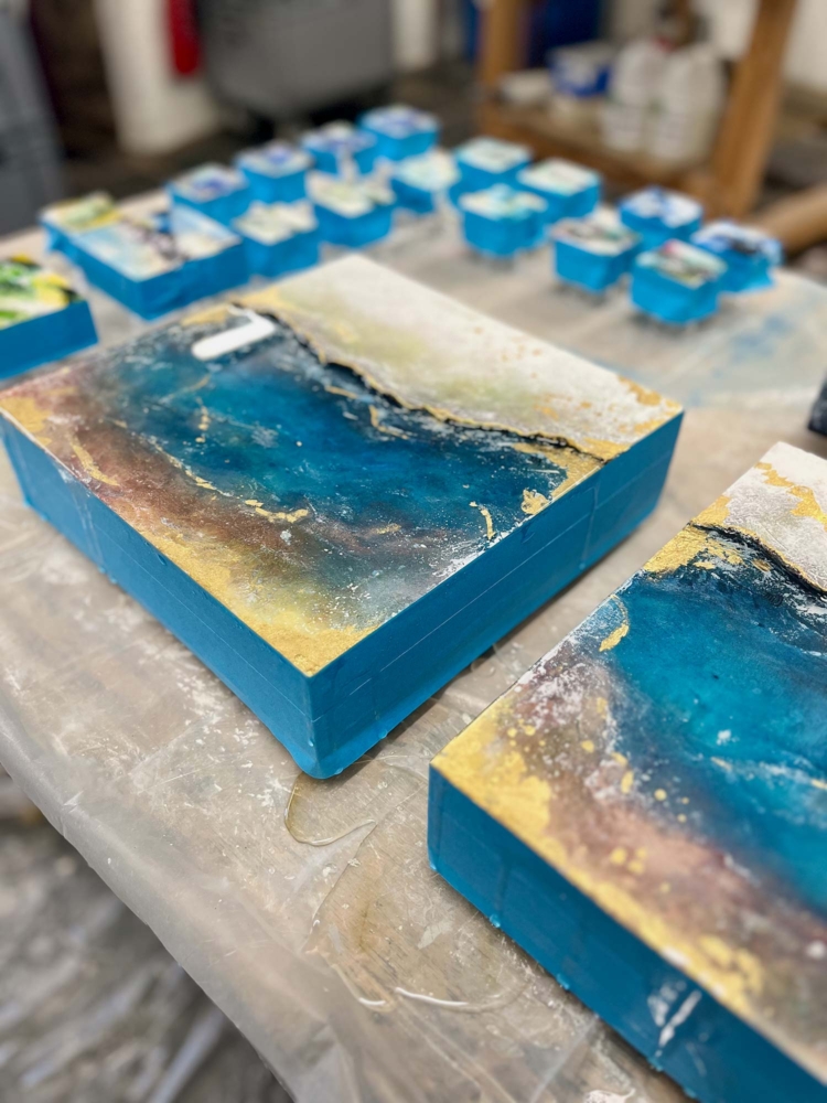 Bevor es soweit war, musste allerdings noch der letzte Arbeitsschritt erfolgen, das Vergießen mit Kunstharz. Dafür hieß es erstmal Atelier aufräumen. Durch meine Arbeit mit Blattgold und Blattsilber war der Raum übersät mit kleinen funkelnden Flocken. Sie segelten bei jedem Luftzug fröhlich durch den Raum. Hübsch anzusehen, aber in flüssigem Kunstharz eher eine Katastrophe. Also bewaffnete ich mich mit Besen und Staubsauger und startete eine kleine Jagd auf die schillernden Blättchen. Danach wurde das Atelier sorgfältig vorbereitet. Folien ausgelegt, die Kanten der Werke abgeklebt, alles auf Position gebracht.