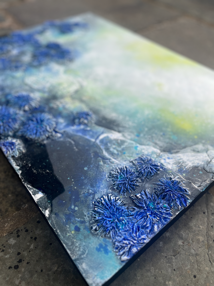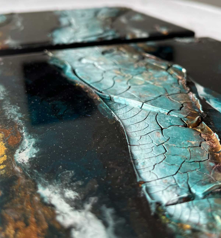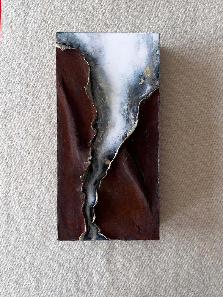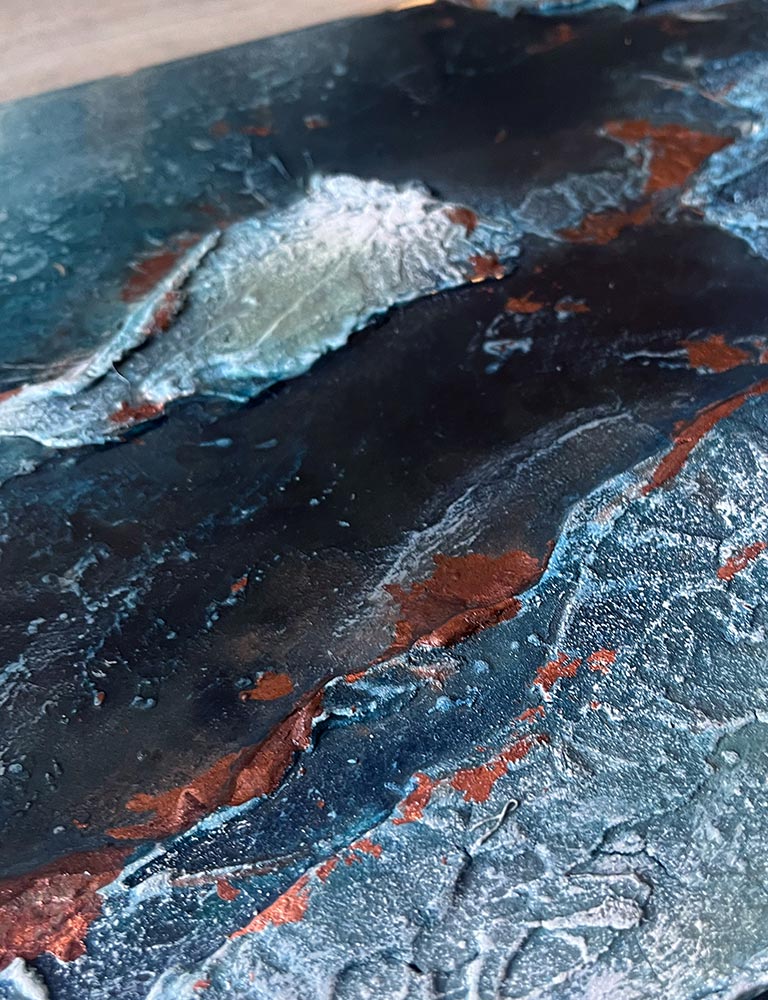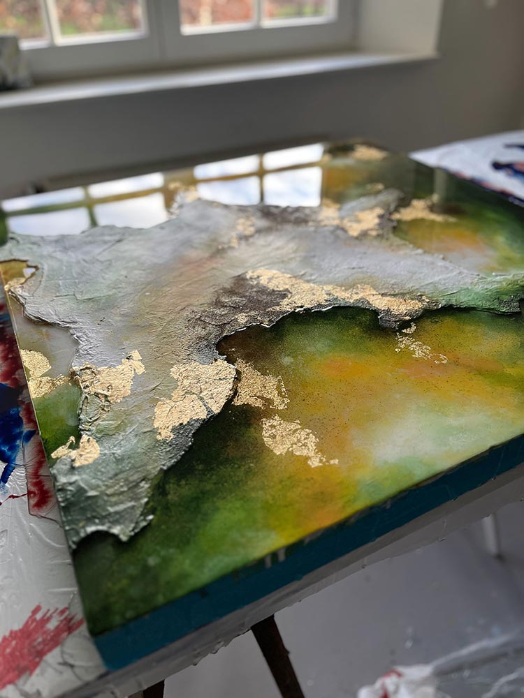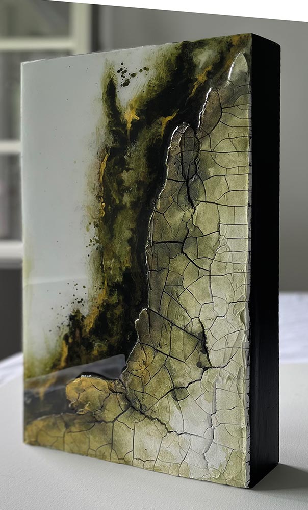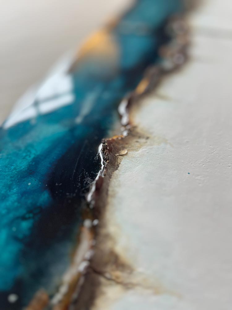 Kompositionen von Gegensätzen verbinden bewusst schroffe Reliefs mit glatten Flächen und leuchtenden Farben. Im Spannungsfeld von rauen, matten und glatt glänzenden Oberflächen entstehen Arbeiten, die Küstenlinien aus der Vogelperspektive, Felsformationen und freie Abstraktionen aufgreifen. Seit der Artist Residency in Schottland und auf den Shetland Inseln prägen raue Weite und stille Klarheit diese Werkgruppe, umgesetzt mit Aquarylic, Kunstharz und Strukturpaste.