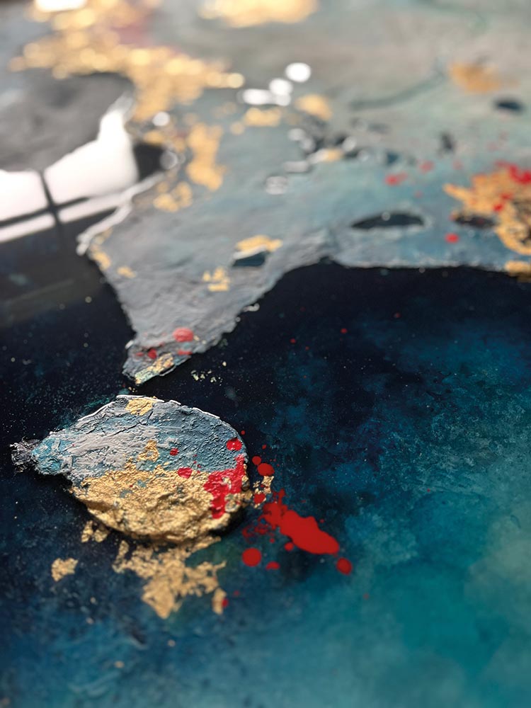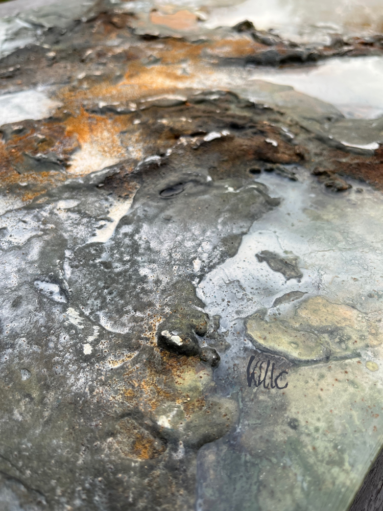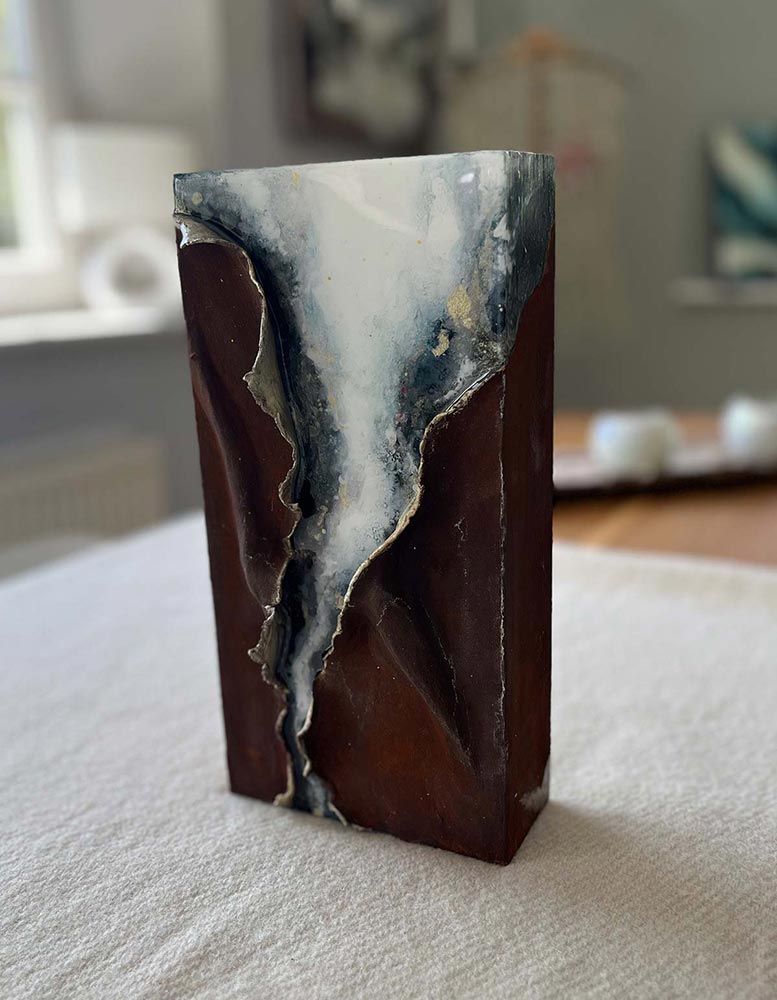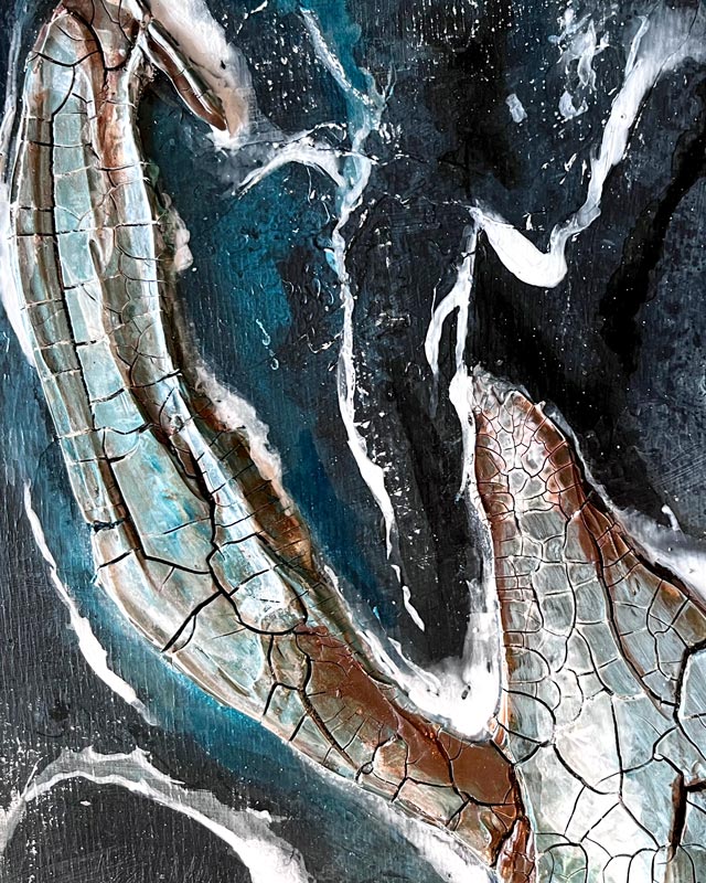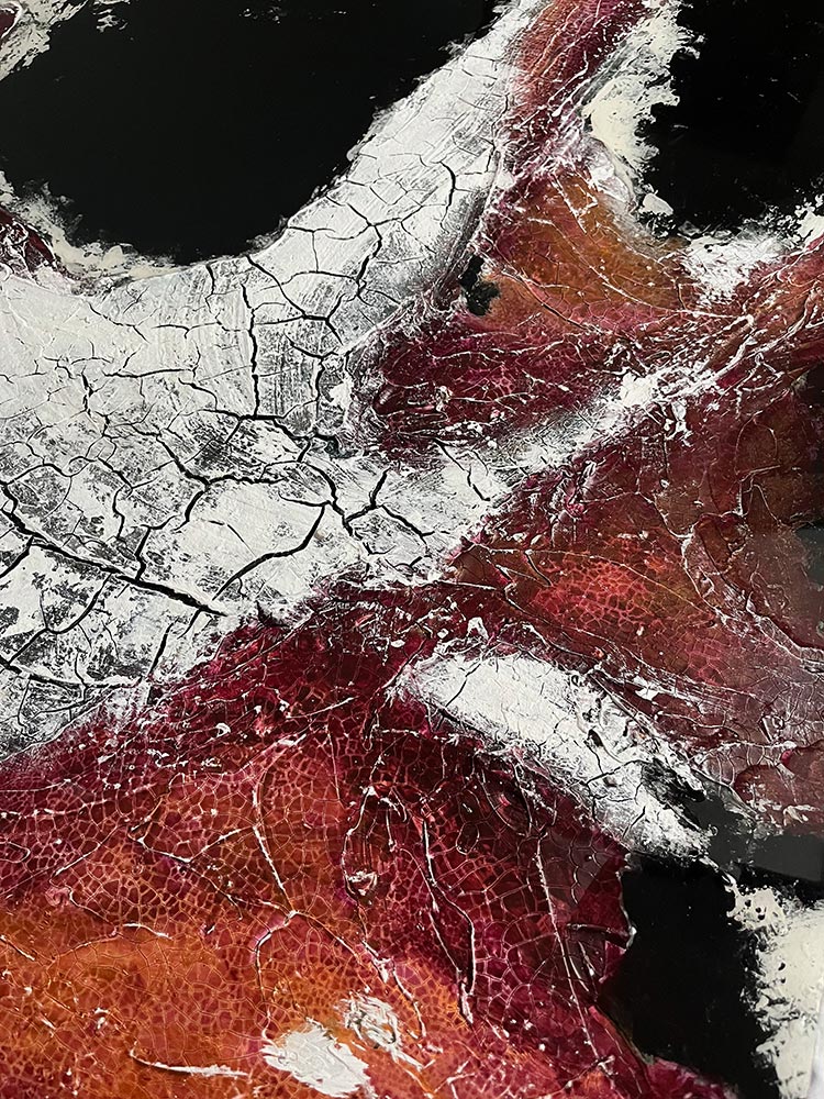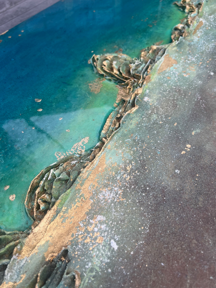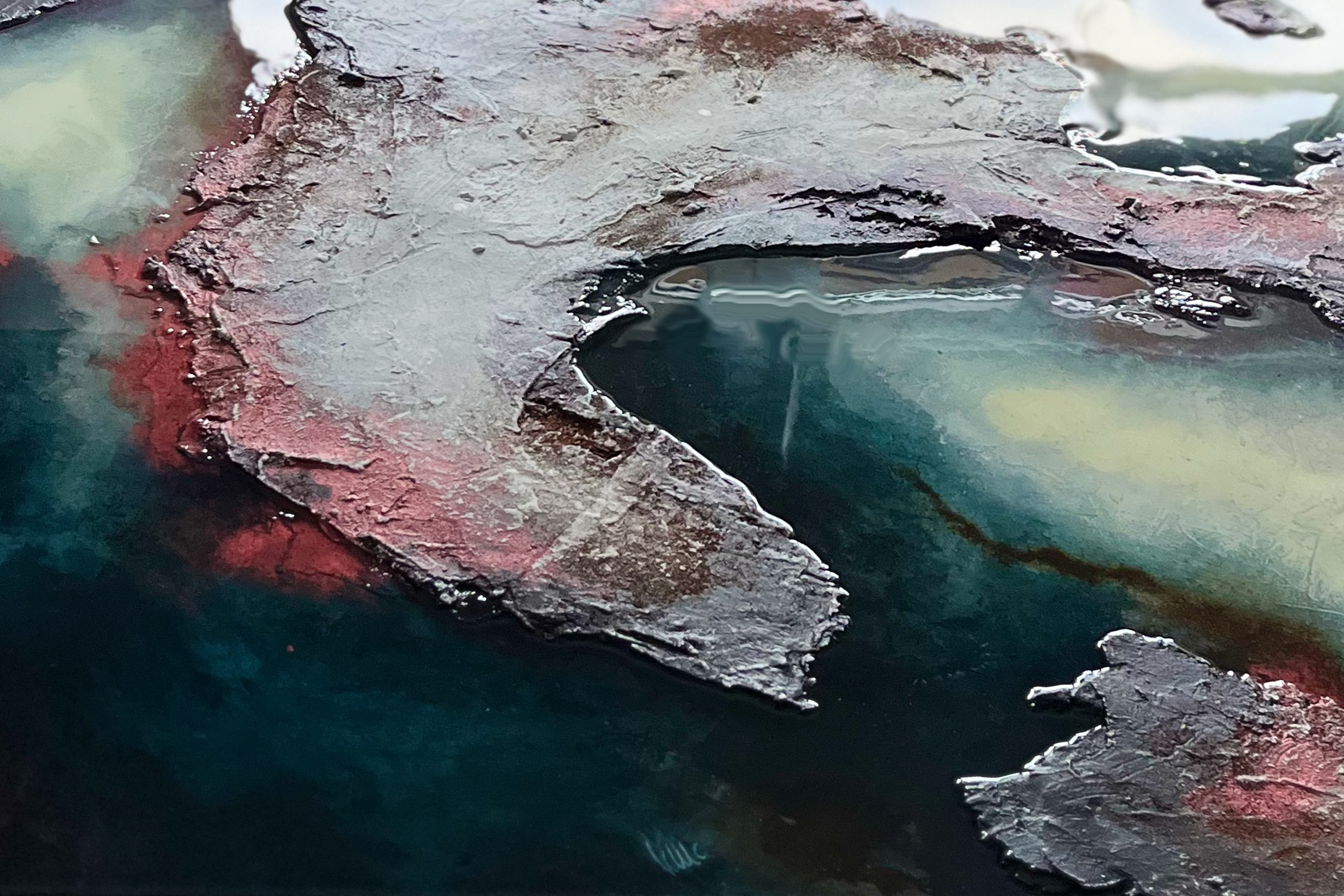 Kompositionen von Gegensätzen verbinden bewusst schroffe Reliefs mit glatten Flächen und leuchtenden Farben. Im Spannungsfeld von rauen, matten und glatt glänzenden Oberflächen entstehen Arbeiten, die Küstenlinien aus der Vogelperspektive, Felsformationen und freie Abstraktionen aufgreifen. Seit der Artist Residency in Schottland und auf den Shetland Inseln prägen raue Weite und stille Klarheit diese Werkgruppe, umgesetzt mit Aquarylic, Kunstharz und Strukturpaste.