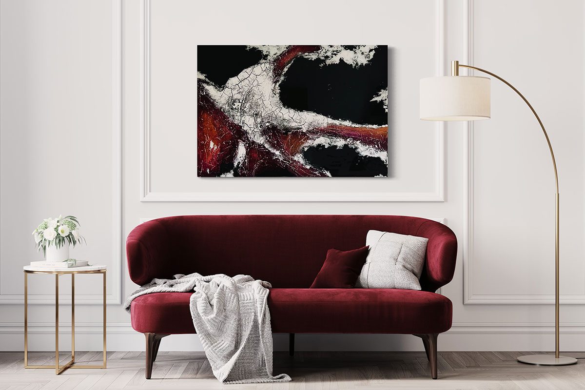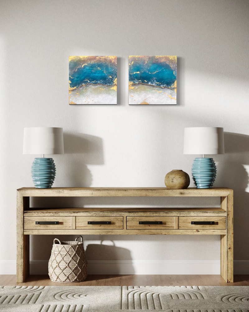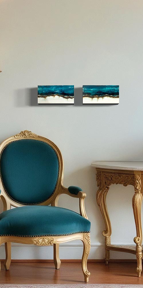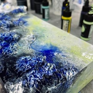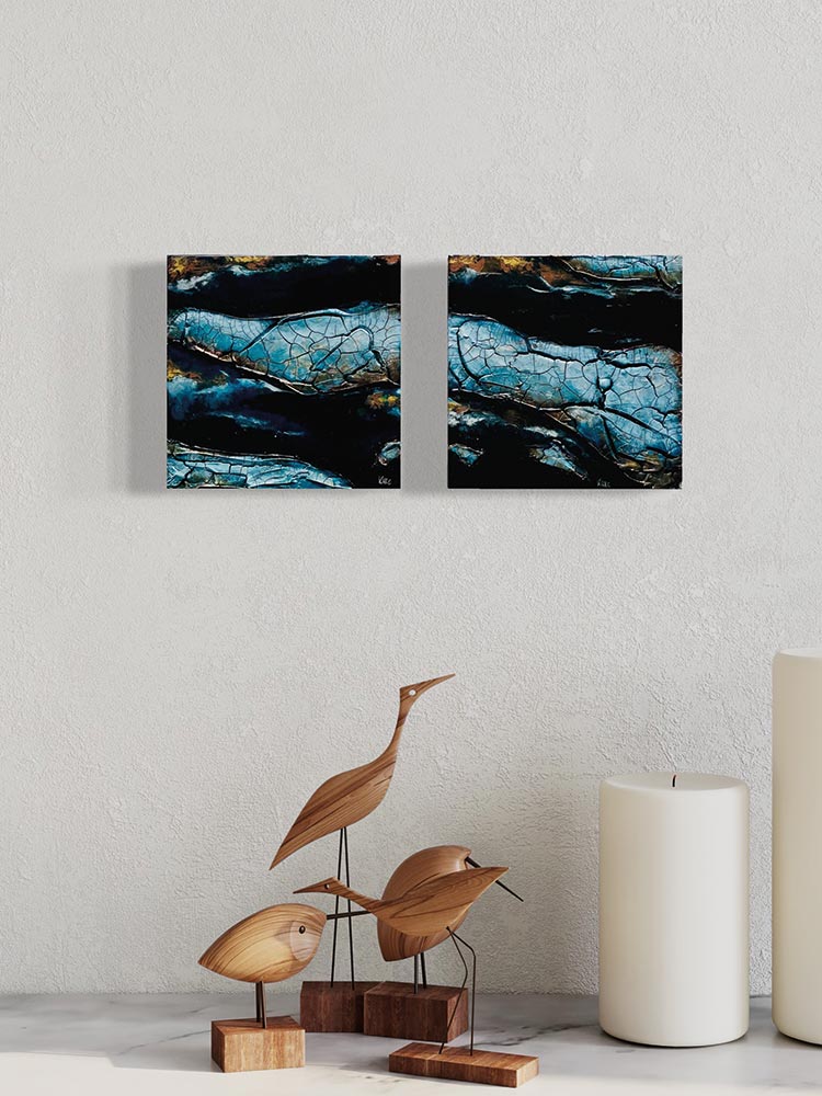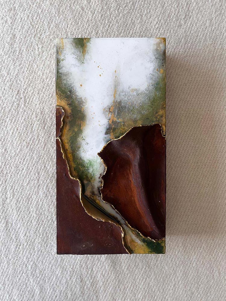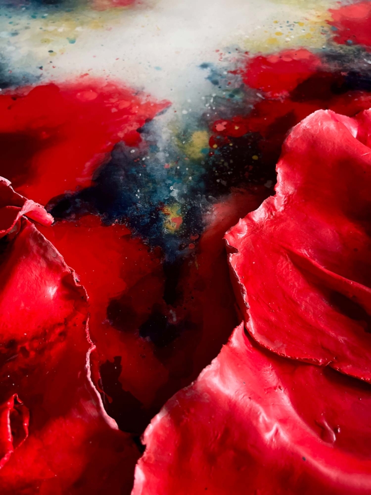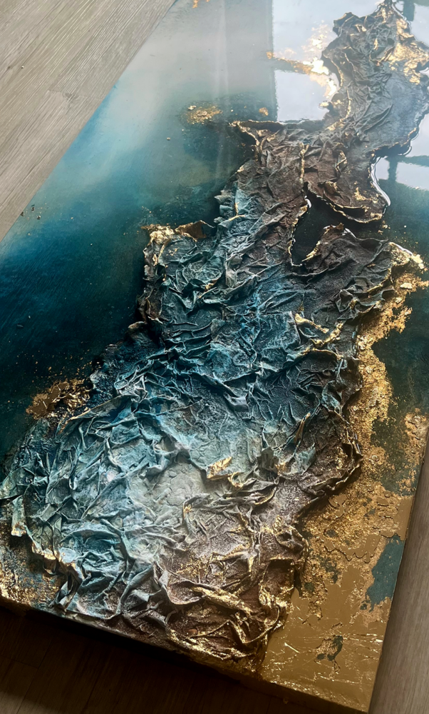Kompositionen von Gegensätzen verbinden bewusst schroffe Reliefs mit glatten Flächen und leuchtenden Farben. Im Spannungsfeld von rauen, matten und glatt glänzenden Oberflächen entstehen Arbeiten, die Küstenlinien aus der Vogelperspektive, Felsformationen und freie Abstraktionen aufgreifen. Seit der Artist Residency in Schottland und auf den Shetland Inseln prägen raue Weite und stille Klarheit diese Werkgruppe, umgesetzt mit Aquarylic, Kunstharz und Strukturpaste.
