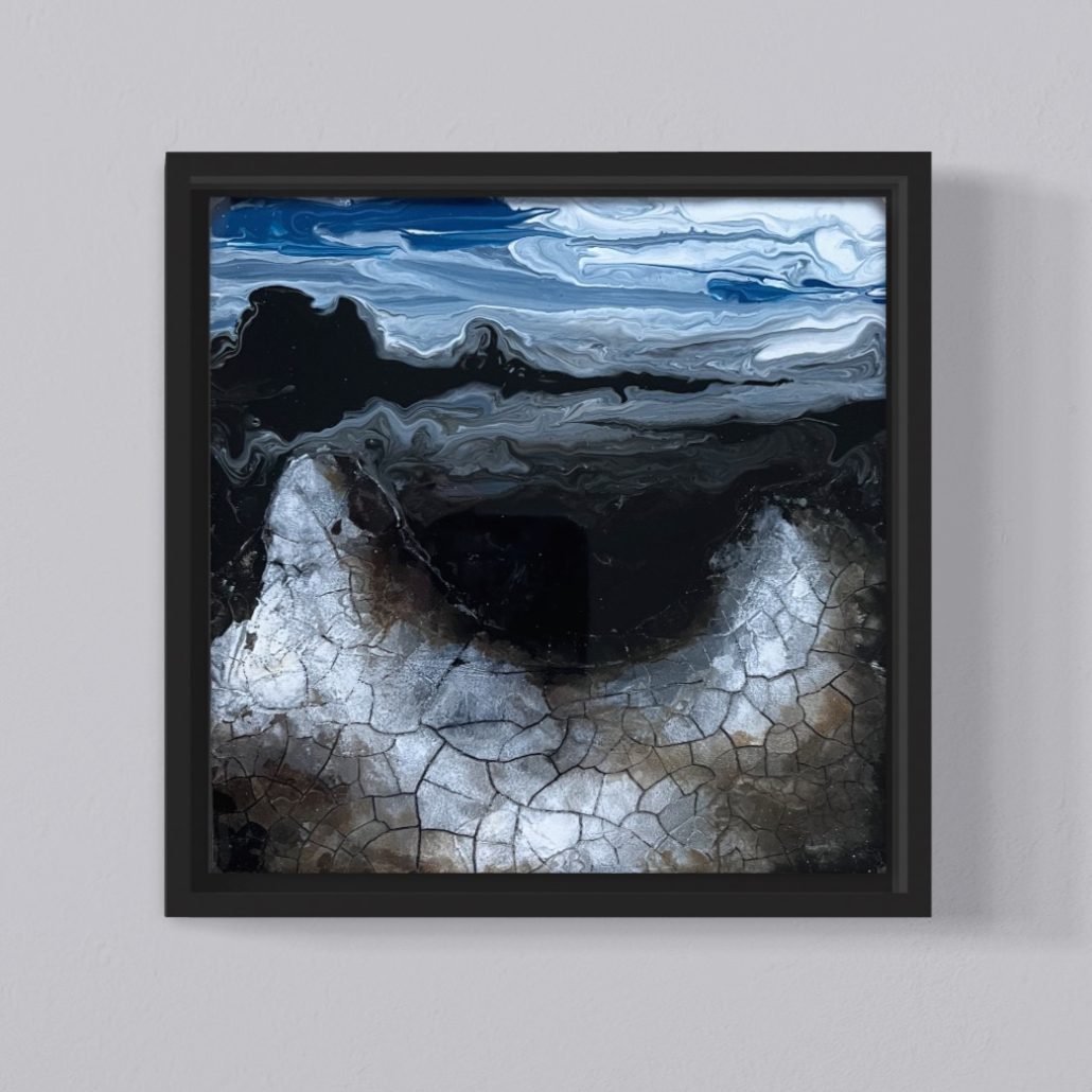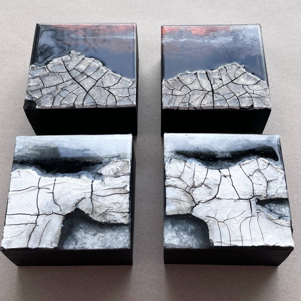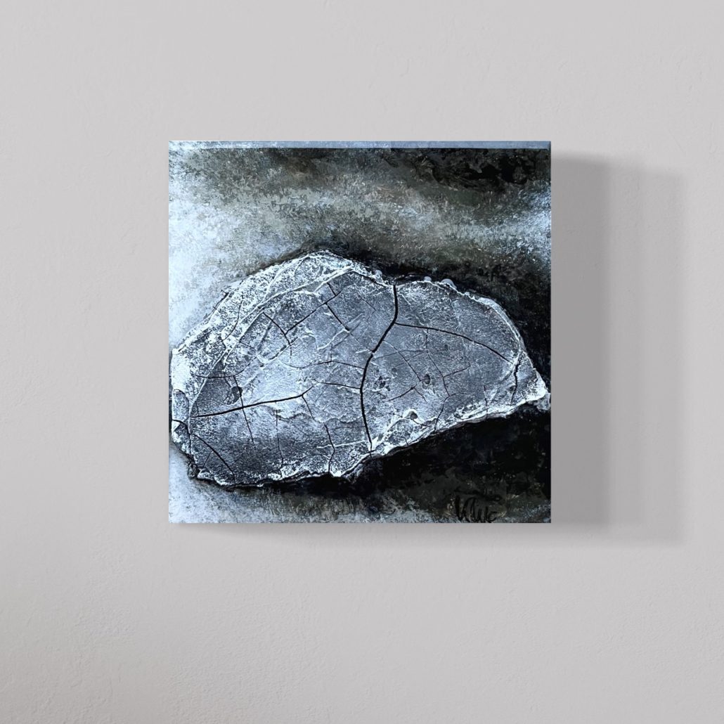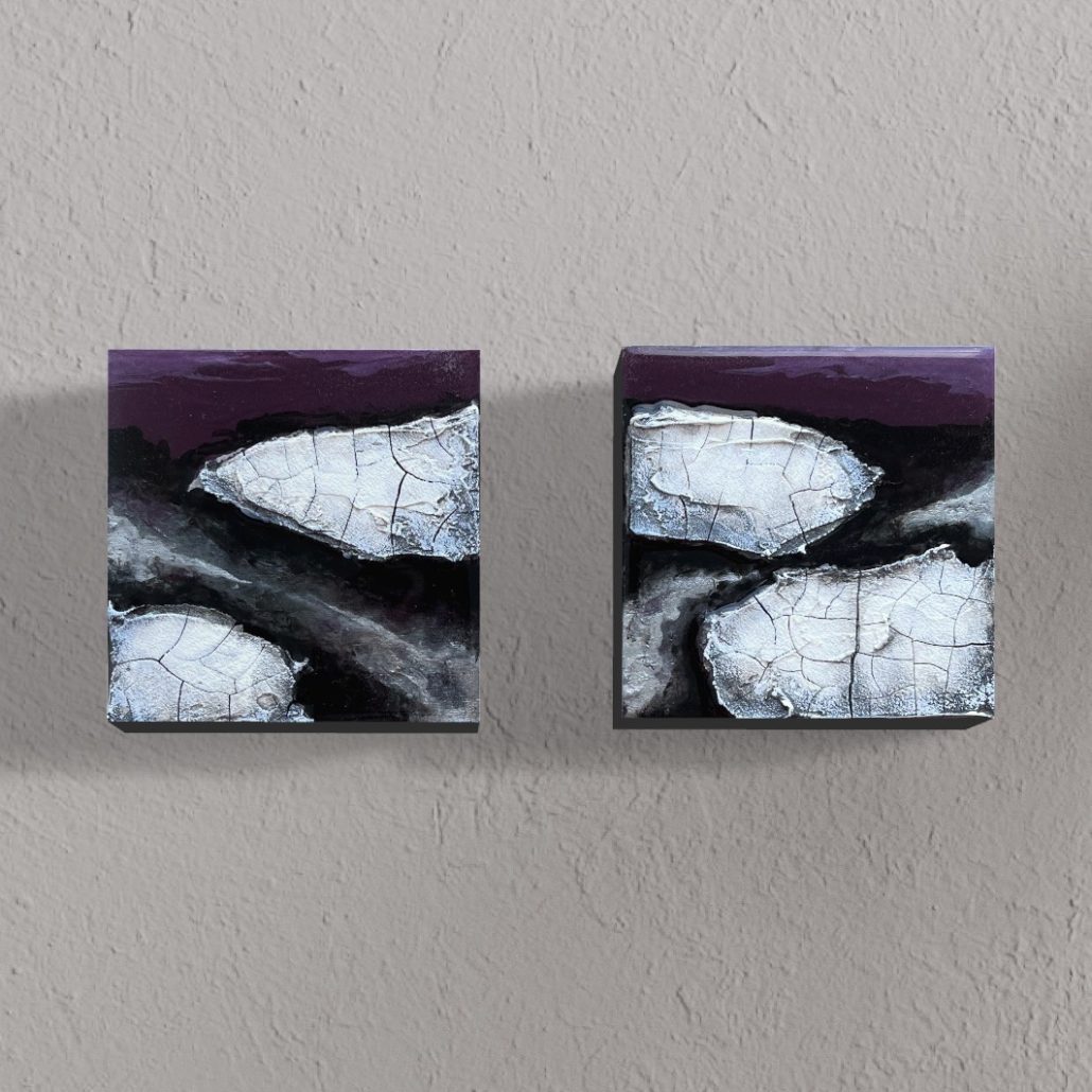 Ich arbeite mit einem Materialmix aus Acryl, Kunstharz und Crackle Paste auf Holzpaneelen, mit dem ich auf jedem Bild einen anderen Aspekt einer wilden, sich verändernden Landschaft einfange. Es ist eine Mischung aus dem Zufall der Crackle Paste, dem lenkenden Prozess der Acrylmalerei und einem feinen Glanz, den das Kunstharz verleiht.