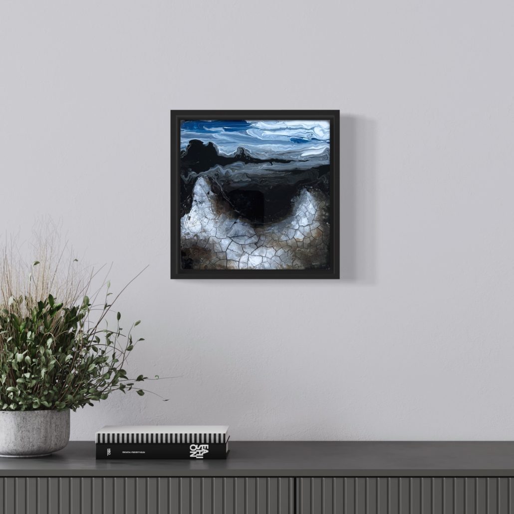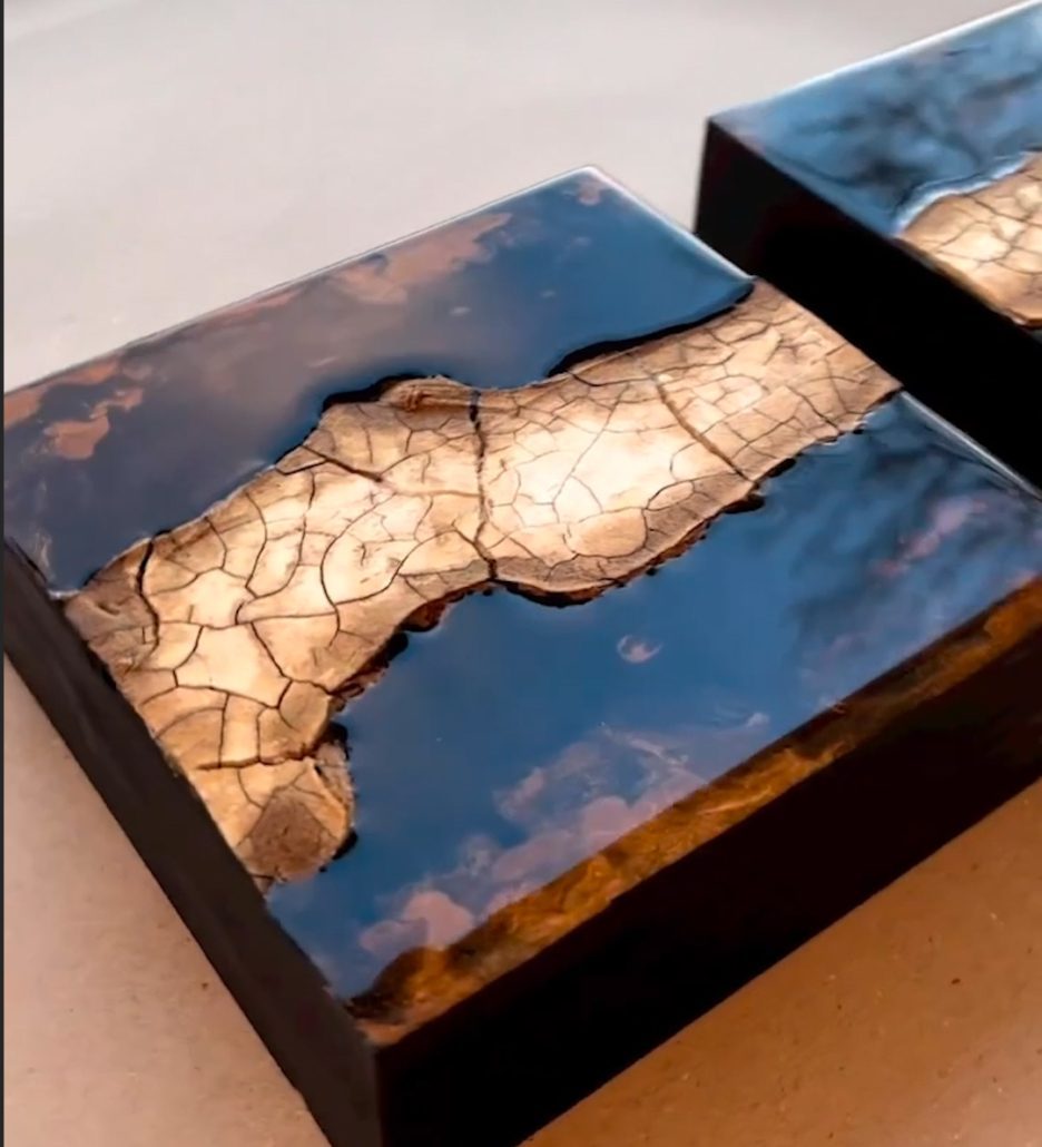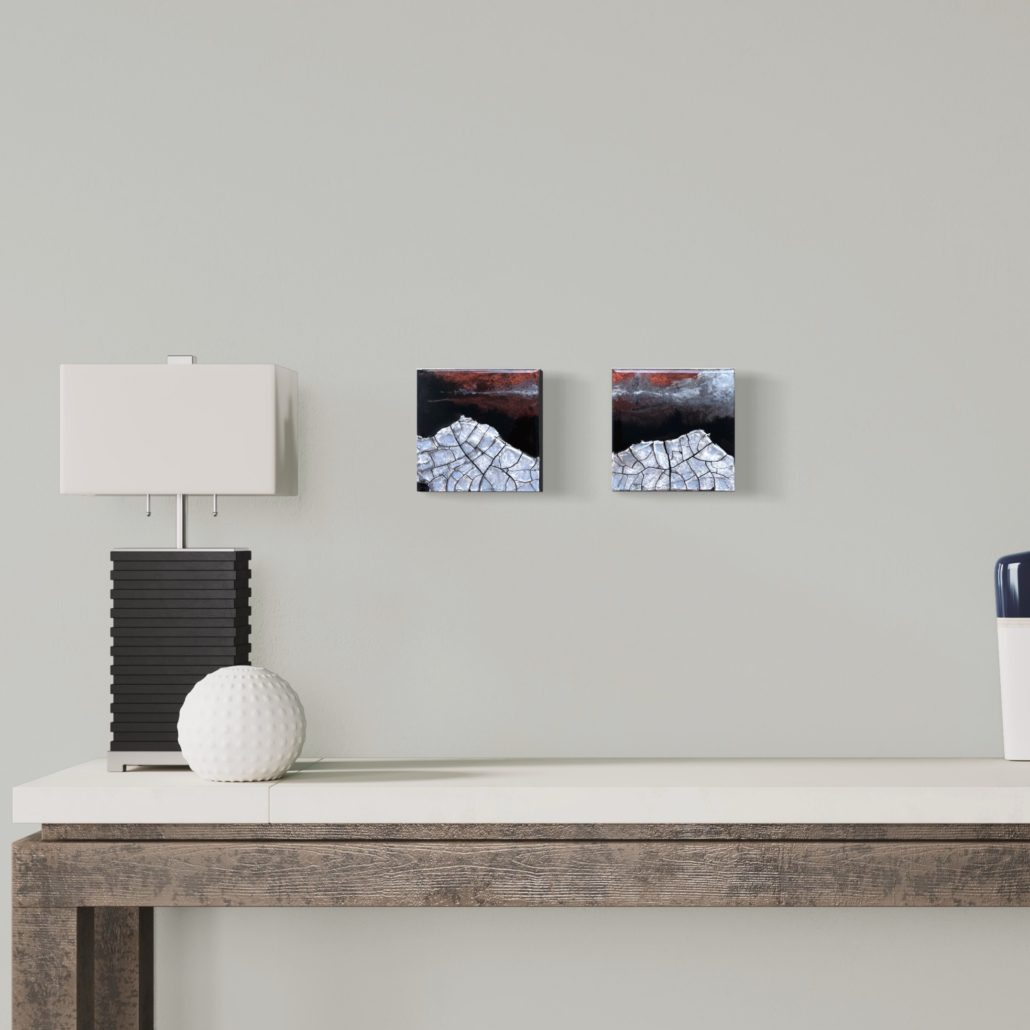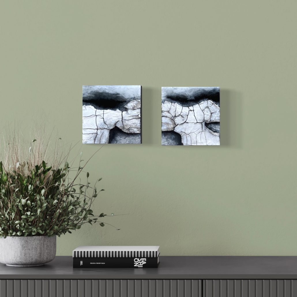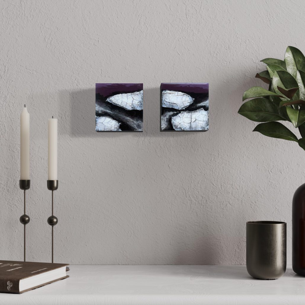 Ich arbeite mit einem Materialmix aus Acryl, Kunstharz und Crackle Paste auf Holzpaneelen, mit dem ich auf jedem Bild einen anderen Aspekt einer wilden, sich verändernden Landschaft einfange. Es ist eine Mischung aus dem Zufall der Crackle Paste, dem lenkenden Prozess der Acrylmalerei und einem feinen Glanz, den das Kunstharz verleiht.